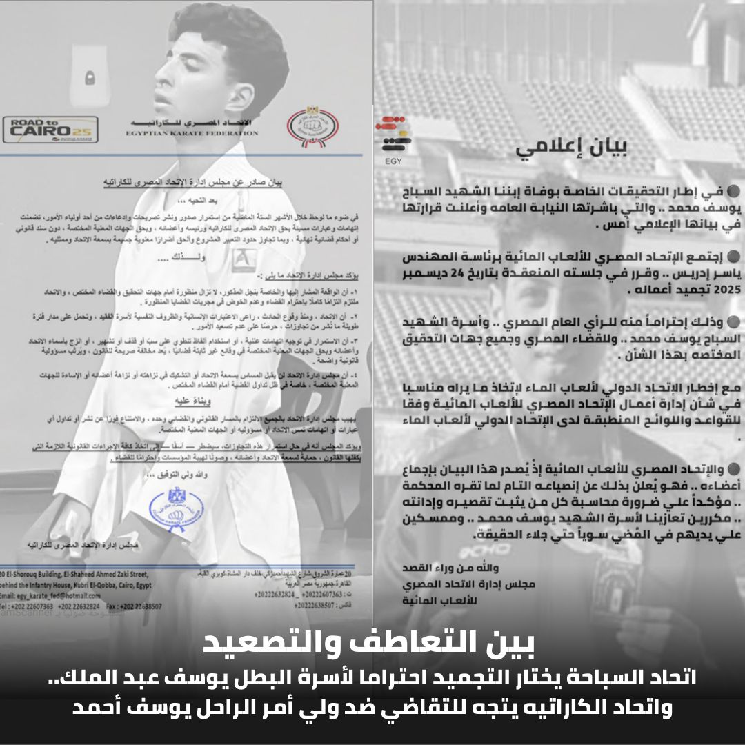 اتحاد السباحة يختار التجميد احتراما لأسرة البطل يوسف عبد الملك.. واتحاد الكاراتيه يتجه للتقاضي