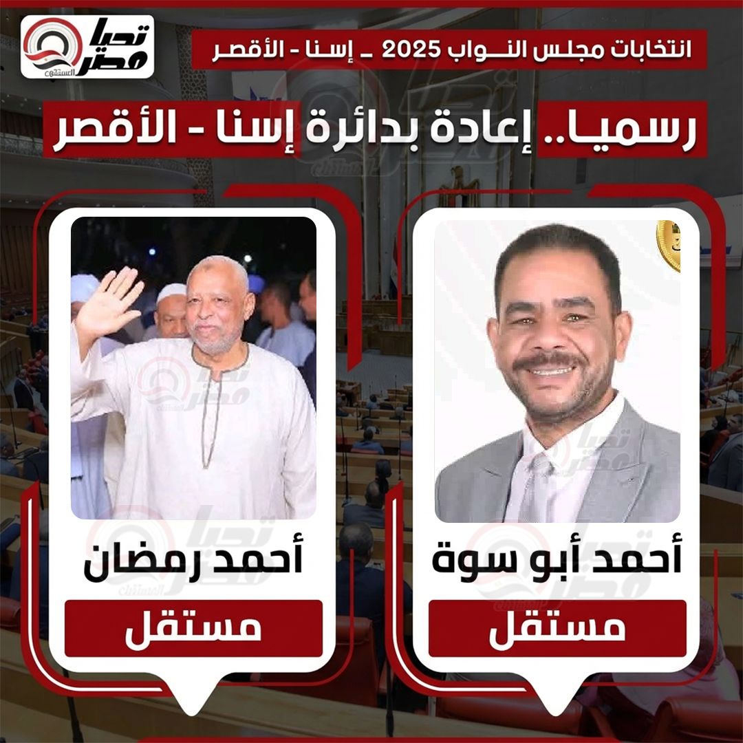أعلنت الهيئة الوطنية للانتخابات، عن إعادة الانتخابات بدائرة إسنا بمحافظة الأقصر، ضمن جولة الإعادة للمرحلة الثانية من انتخابات مجلس النواب 2025.
