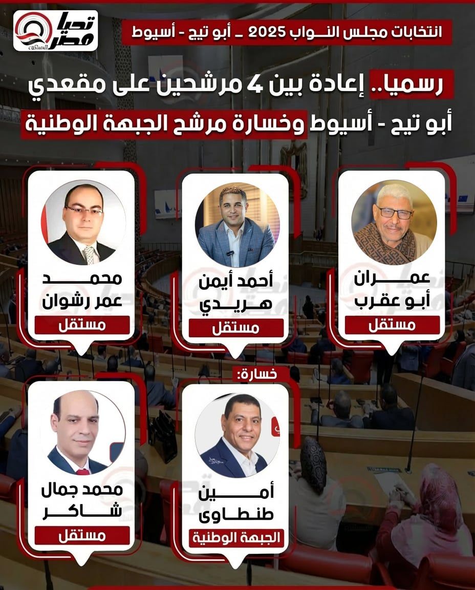 وأسفرت نتيجة الانتخابات عن خوض جولة إعادة بين 4 مرشحين في دائرة أبو تيج في محافظة أسيوط وهم المرشح عمران أبو عقرب (مستقل)، و أحمد أيمن هريدي (مستقل) و محمد عمر رشوان (مستقل)، ومحمد جمال شاكر (مستقل)، ويتانفسون جميعا للحصول على المقعدين المخصصين للدائرة داخل مجلسش النواب في الفصل التشريعي الثالث.
