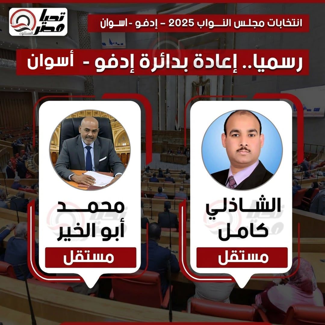 أعلنت الهيئة الوطنية للانتخابات عن نتائج دائرة إدفو بمحافظة أسوان ضمن جولة الإعادة للمرحلة الثانية من انتخابات مجلس النواب، وأسفرت النتيجة عن خوض جولة الإعادة بين كل من المرشح المستقل محمد أبو الخير، والمرشح المستقل الشاذلي كامل.