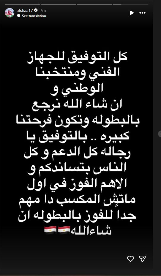 تحيا مصر، وكتب أفشة عبر حسابه الرسمي" إنستجرام": كل التوفيق للجهاز الفني ومنتخبنا الوطني، وإن شاء الله نرجع بالبطولة وتكون فرحتنا كبيرة".