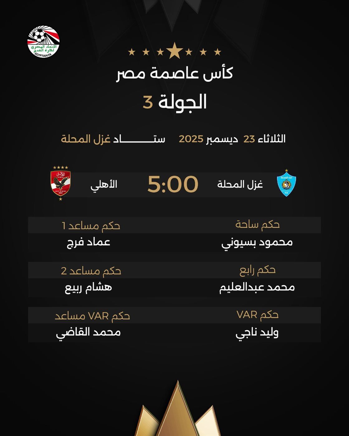 أعلنت لجنة الحكام الرئيسية بالجبلاية، عن أسماء حكام مباريات الغد، بـكأس عاصمة مصر (موسم 2025/ 2026).