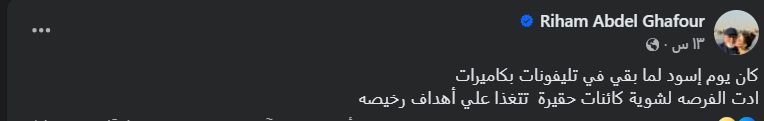 وعلقت ريهام عبر حسابها الرسمي على موقع فيسبوك قائلة: “كان يوم إسود لما بقي في تليفونات بكاميرات، ادت الفرصه لشوية كائنات حقيرة تتغذا علي أهداف رخيصه”.