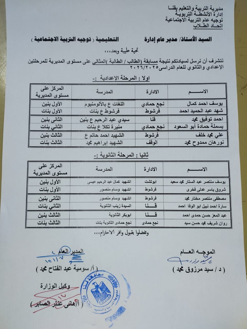 أعلنت مديرية التربية والتعليم بقنا، عن نتيجة مسابقة الطالب المثالي لمرحلتي الإعدادي والثانوي و التي نفذها توجيه عام التربية الاجتماعية تحت رعاية هانى عنتر الصابر وكيل وزارة التربية والتعليم بقنا و إشراف سوميه عبدالفتاح مدير عام الشئون التنفيذية وتنفيذ الدكتور سيد مرزوق موجه عام التربية الاجتماعية.
