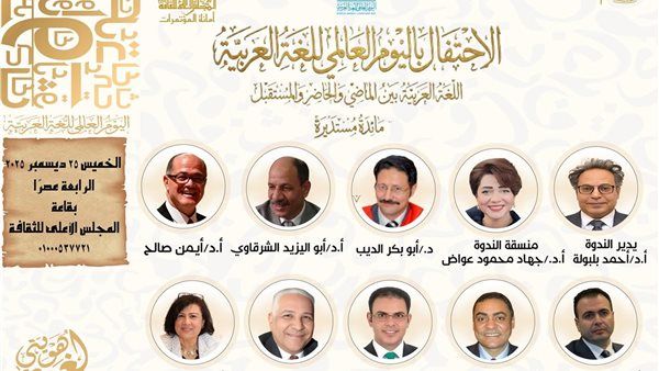 احتفالا باليوم العالمي للغة العربية، يقيم المجلس الأعلى للثقافة دائرة مستديرة، بعنوان "اللغة العربية بين الماضي والحاضر والمستقبل"، وذلك في تمام الرابعة، غدا الخميس 25 ديسمبر 2025 بقاعة المجلس الأعلى للثقاقة.