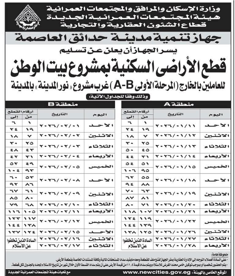 أعلن جهاز تنمية مدينة حدائق العاصمة تسليم قطع الأراضى السكنية بمشروع بيت الوطن للعاملين بالخارج (المرحلة الأولى A-B ) غرب مشروع "نور المدينة" بحدائق العاصمة.