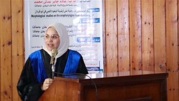 المقدمة من الباحثة غاده جابر عدلى محمد، المعيد بقسم التشريح والأجنة بالكلية، وجاءت الرسالة بعنوان "دراسات مورفولوجية على أرضية البلعوم الفمي في أبو قردان".