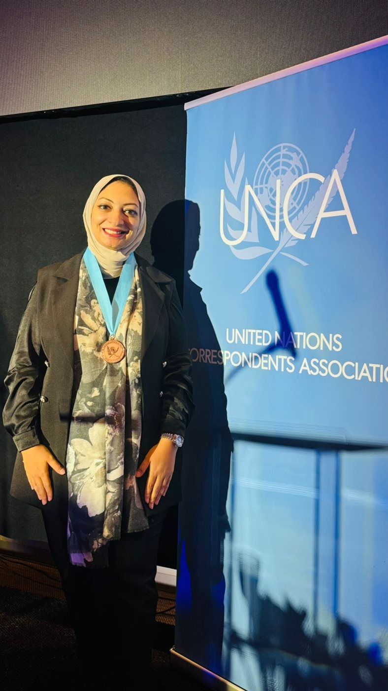 وأردفت: “وتسلمت الصحفية المصرية الميدالية البرونزية للجائزة في مدينة نيويورك في الولايات المتحدة الأمريكية، في مقر الأمم المتحدة خلال حفل الجوائز التاسع والعشرين لرابطة مراسلين الأمم المتحدة، وسلمتها الجائزة السفيرة إيزابيل بيكو، الممثلة الدائمة لإمارة موناكو لدى الأمم المتحدة”.