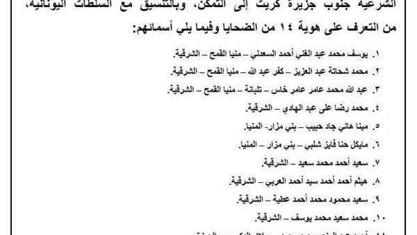يتابع أهالي الضحايا الثلاث بمحافظة المنيا ، حادث غرق مركب هجرة غير شرعية باليونان ، لمعرفة وصول الجثامين الثلاث لضحاياهم ، حيث أسفرت المتابعة المستمرة للسفارة المصرية ، لتداعيات الحادث الأليم لغرق مركب الهجرة غير الشرعية ، جنوب حزيرة كريت ، إلى التمكن وبالتنسيق مع السلطات اليونانية ، من التعرف على هوية 14 شابا من الضحايا المصريين ، وفيما يلي أسمائهم.