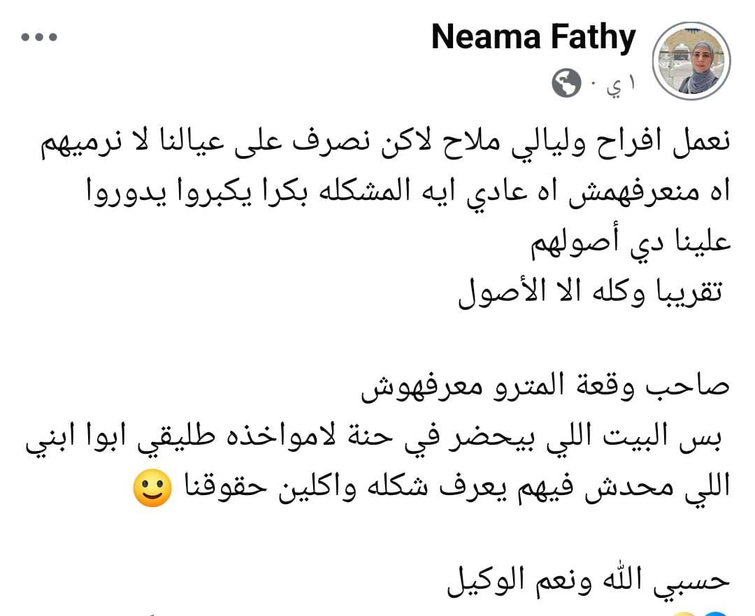 وكشفت أن منشوراتها أُسيء فهمها، مؤكدة أن رسالتها لم تكن موجهة إلى صاحب واقعة المترو على الإطلاق، وإنما إلى أسرة طليقها، خاصة بعد ظهور والد طليقها في أحد مقاطع الفيديو وهو يدافع عن صاحب الواقعة والتحدث باسم الأصول والدين، على حد تعبيرها.