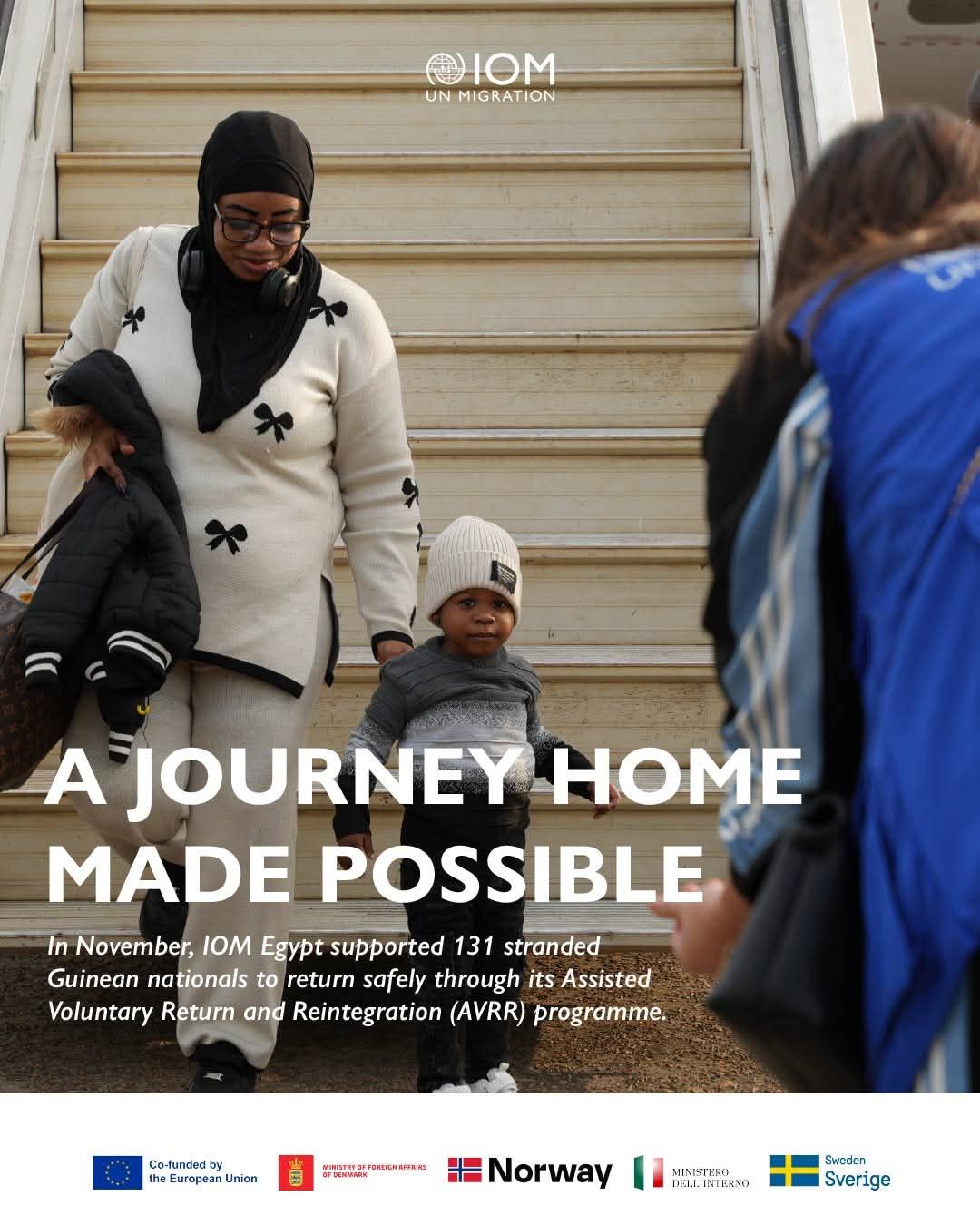 أعلنت المنظمة الدولية للهجرة في مصر (IOM Egypt) عن تسهيل العودة الطوعية الآمنة والكريمة لـ131 مواطنًا من جمهورية غينيا إلى العاصمة كوناكري، وذلك خلال شهر نوفمبر، في إطار جهودها المستمرة لدعم الإدارة الإنسانية للهجرة وحماية المهاجرين.