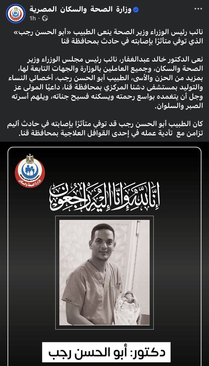 وقد توفي الطبيب أبو الحسن رجب، متأثرًا بإصابته في حادث أليم تزامن مع تأدية عمله في إحدى القوافل العلاجية بمحافظة قنا، حيث أصيب بطلق ناري، خلال مشاركته في قافلة طبية بقرية العطيات التابعة لمركز دشنا، شمال قنا، وجرى نقله إلى مستشفى قنا العام لتلقى العلاج اللازم.