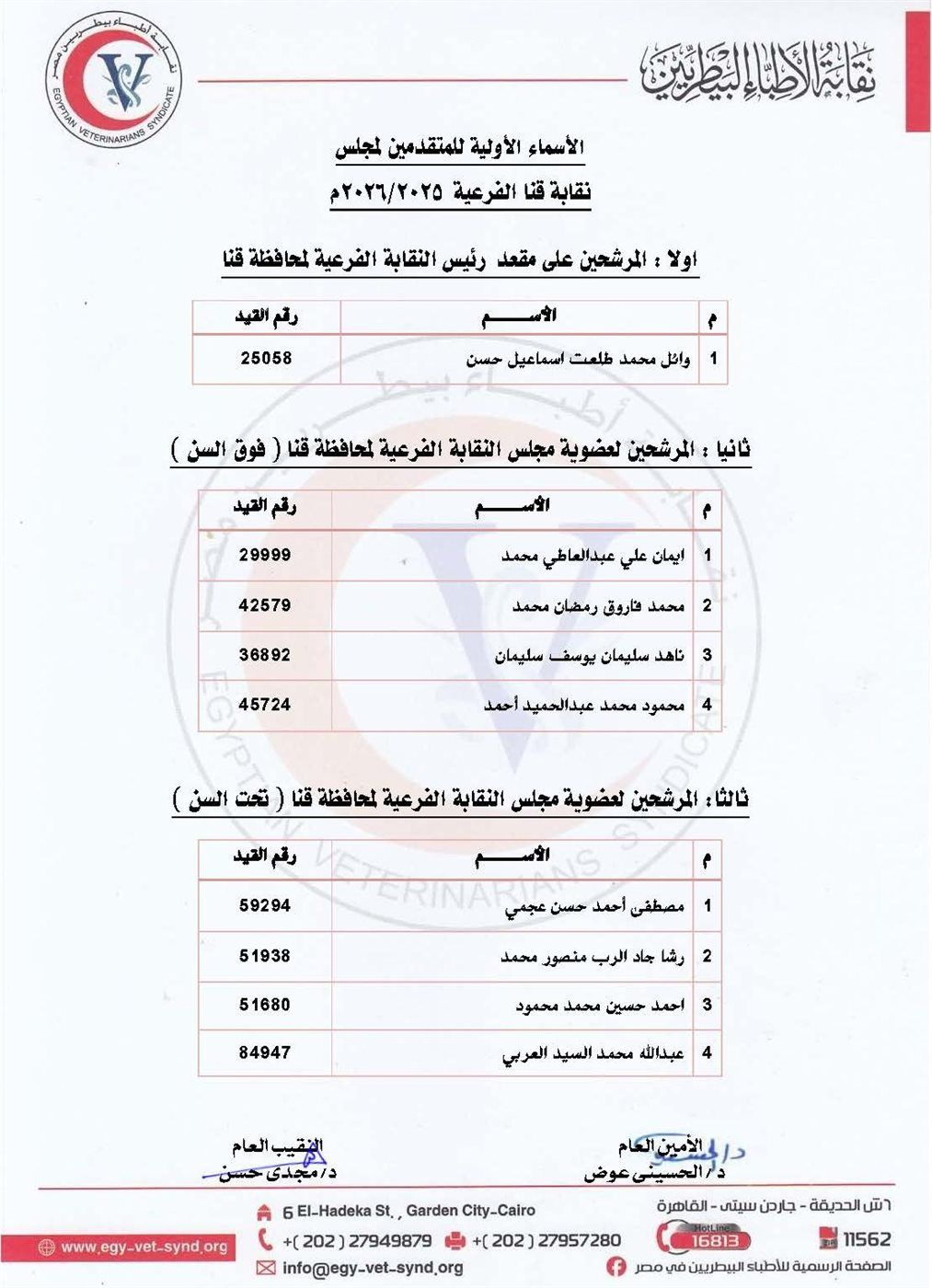 أعلنت النقابة العامة للأطباء البيطريين، برئاسة الدكتور مجدى حسن النقيب العام، عن الكشوف الأولية للمرشحين بانتخابات التجديد النصفي للنقابة العامة للأطباء البيطريين، وكذلك مجلس النقابة الفرعية بمحافظة قنا، وذلك في إطار الإجراءات التنظيمية الخاصة بالعملية الانتخابية.