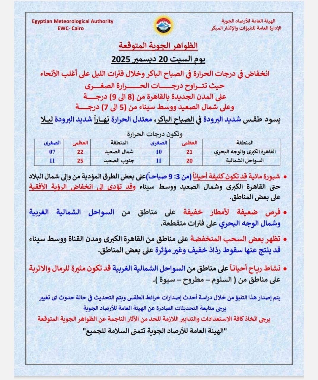 كشفت الهيئة العامة للأرصاد الجوية ملامح الحالة الجوية المتوقعة اليوم السبت 20 ديسمبر 2025، مؤكدة استمرار الأجواء الشتوية الباردة مع انخفاض واضح في درجات الحرارة خلال ساعات الصباح الباكر وفترات الليل المتأخرة على معظم أنحاء الجمهورية.
