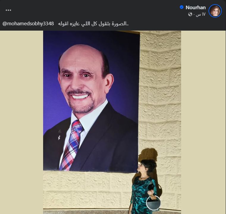 شاركت الفنانة نورهان شعيب صورة تجمعها بلوحة كبيرة للفنان محمد صبحي وهي تنظر لها بكل فخر وذلك عبر صفحتها الرسمية على موقع التواصل الإجتماعي فيسبوك، معبرة عن دعمها الكامل له دون مبالغة قائلة:" الصورة بتقول كل اللي عايزه اقوله".