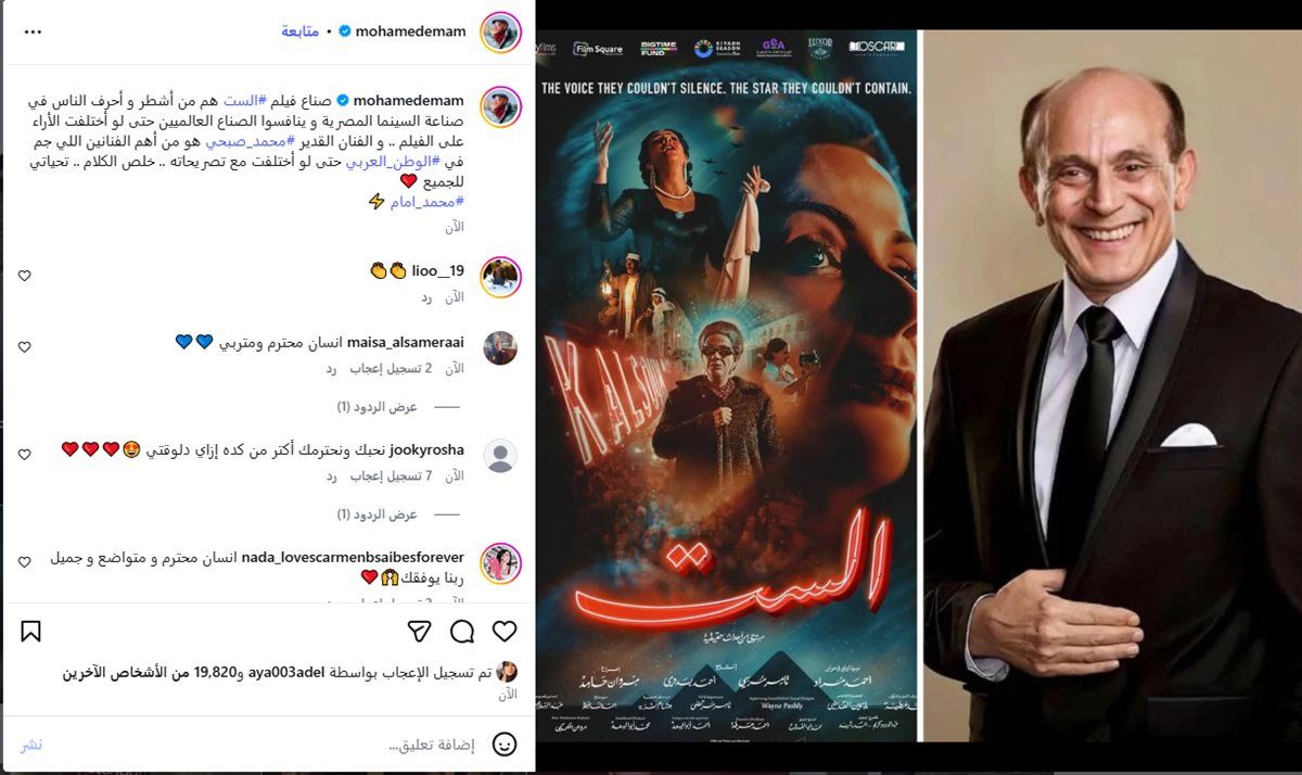 وجه الفنان محمد إمام رسالة دعم وإشادة إلى صُناع فيلم الست، بطولة الفنانة منى زكي، والذي يتناول السيرة الذاتية لأسطورة الغناء العربي أم كلثوم، مؤكدًا تقديره الكبير لصناع العمل ودورهم البارز في صناعة السينما المصرية.