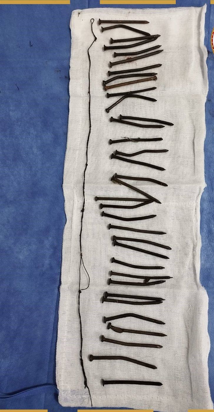 وأضاف الدكتور محمد الغول، استشاري أمراض الجهاز الهضمي والكبد والمناظير، عندما جاءت الحالة تم عمل سونار وطلبنا أشعة، فبينت عدم وجود جرح بالقولون المستعرض، فطلبنا أشعة مقطعية على البطن وتم تحضيرها، وتم وضعها تحت تأثير المخدر الكلي للمحافظة على مجرى التنفس، ومن خلال استخدام المنظار وجدنا كمية من المسامير، وجدنا 34 مسمار، وتم توثيق ذلك بالفيديو.