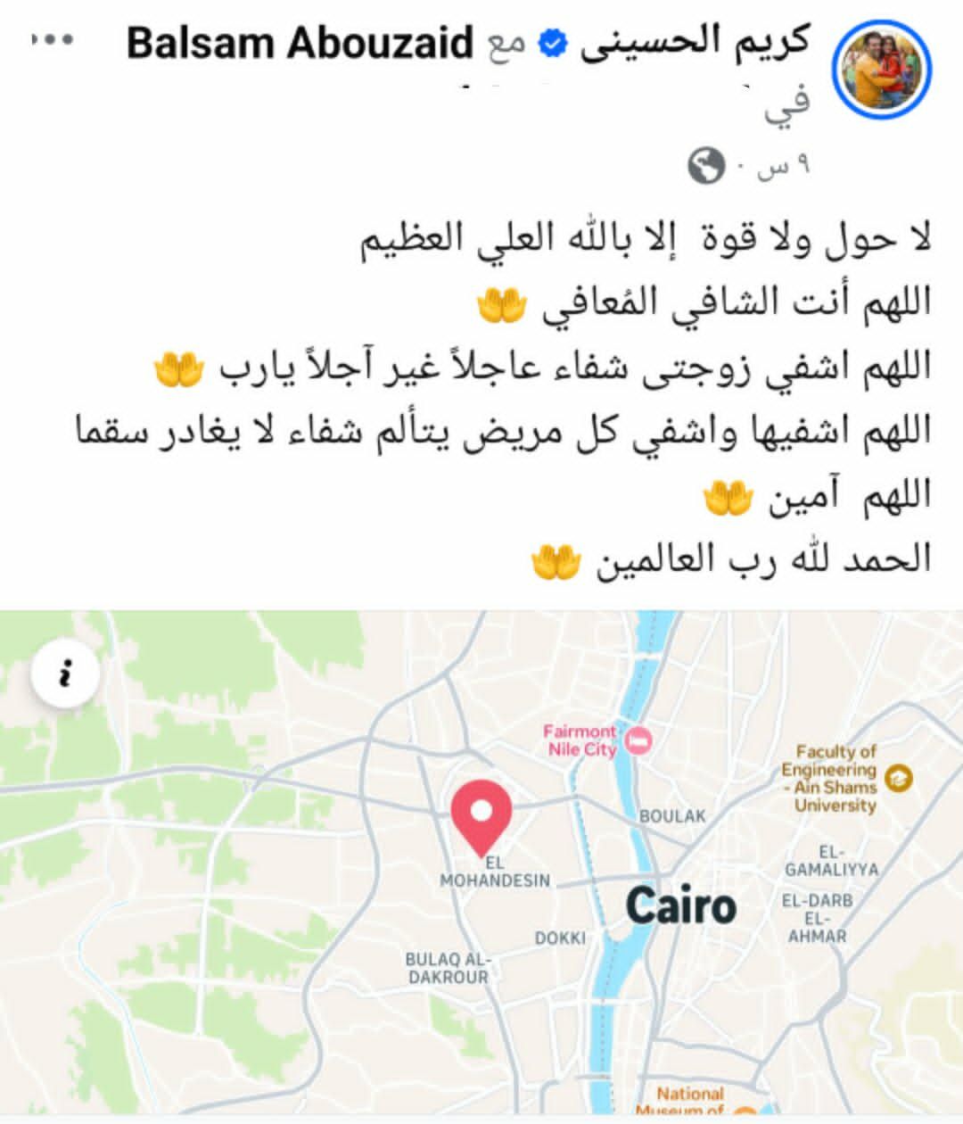 وكتب :" لا حول ولا قوة إلا بالله العلي العظيم، اللهم أنت الشافي المُعافي، اللهم اشفي زوجتي شفاءً عاجلًا غير آجل يارب، اللهم اشفيها واشفِ كل مريض يتألم شفاءً لا يغادر سقمًا، اللهم آمين، الحمد لله رب العالمين.